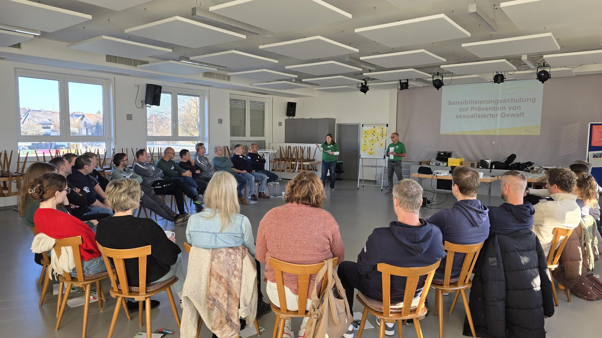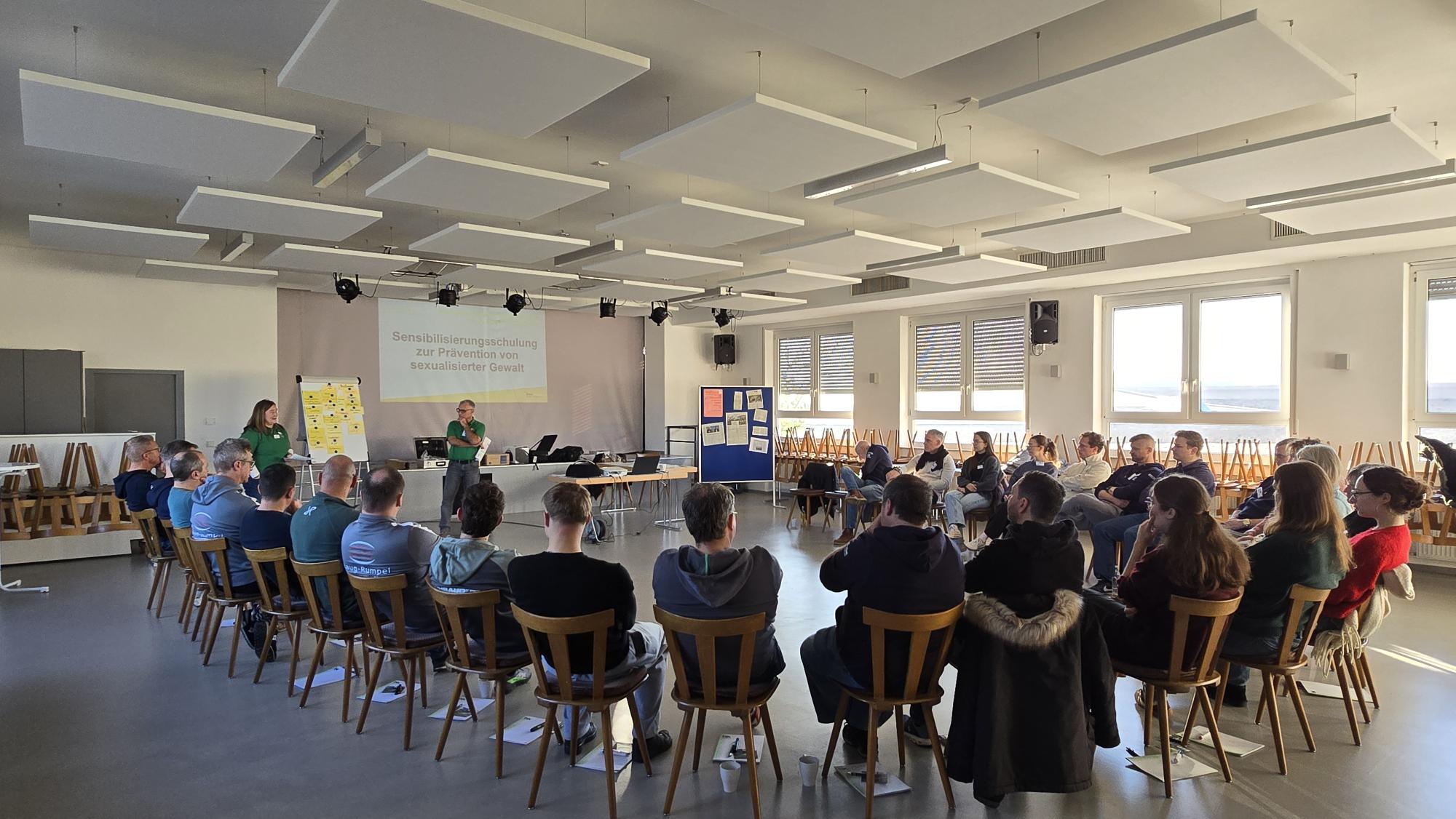 Als Referenten begrüßte der Verein Renate Wendel und Michael Hannawacker vom DJK-Diözesanverband Würzburg. Die insgesamt 27 Teilnehmenden gefiel die Art und Weise, in der die beiden Dozenten ein Thema vermittelten, das naturgemäß mit Unsicherheiten, Ängsten und vielen Fragen verbunden ist. Nach einer Vorstellungsrunde ging es zunächst darum, eigene Grenzen ebenso wie die der anderen wahrzunehmen, vor allem im Hinblick auf körperliche wie auch verbale Formen von Gewalt. Diese Sensibilisierungsarbeit bildete den Übergang zu mehreren Workshop-Phasen, in denen die Teilnehmenden sich intensiv mit Nähe und Distanz sowie mit Daten, Fakten und Erfahrungswerten auseinandersetzten. Gerade dieser Teil half, das Bewusstsein für die gesellschaftliche und persönliche Relevanz des Themas weiter zu schärfen.